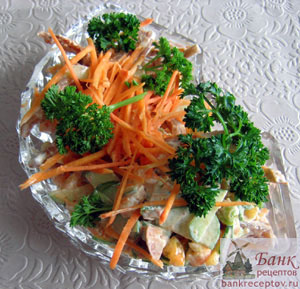 Этот салат из свиных ушек может подать в качестве закуски под водочку. Для него потребуется 200 г маринованных свиных ушек (покупаются в отделе корейских салатов), 1 огурец, 1 болгарский перец желтого цвета, майонез. Ингредиенты нарезать кусочками, смешать, заправить небольшим! количеством майонеза. Посыпать салат кунжутом и украсить корейской морковью и зеленью. Приятного аппетита!