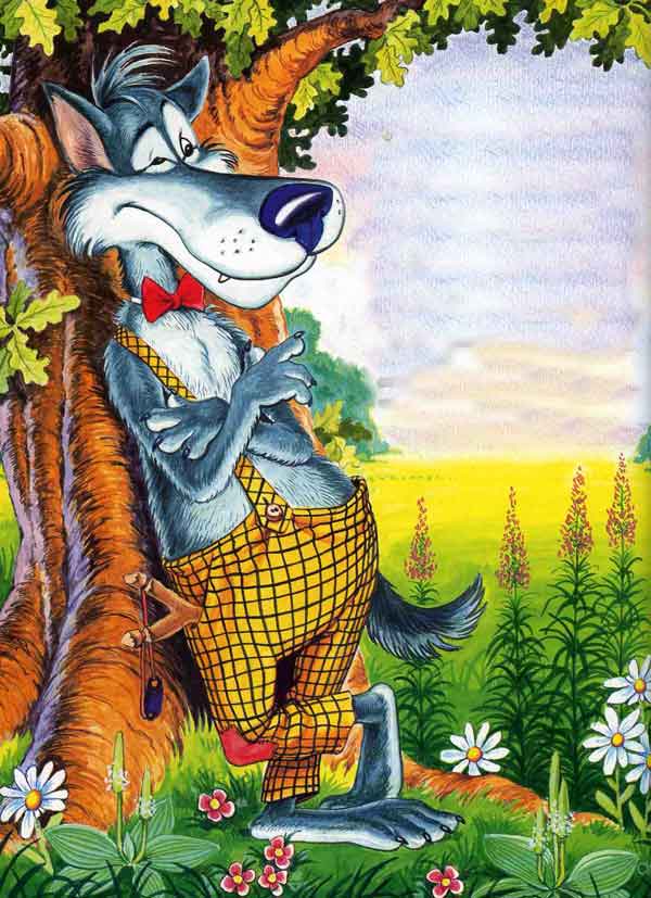 - Здравствуй, брат Михайло Иваныч! - Здравствуй, брат Левон! Что, не видал лисицы с мужем? - Нет, брат, давно дожидаюсь. - Ступай, зови. - Нет, не пойду, Михайло Иваныч! Сам иди, ты посмелей меня. - Нет, брат Левон, и я не пойду. Вдруг откуда ни взялся - бежит заяц. Медведь как крикнет на него: - Поди-ка сюда, косой! Заяц испугался, прибежал. - Ну что, косой пострел, знаешь, где живёт лисица? - Знаю, Михайло Иваныч! - Ступай же скорее да скажи ей, что Михайло Иваныч с братом Левоном Иванычем давно уже готовы, ждут тебя с мужем, хотят поклониться бараном да быком. Заяц пустился к лисе во всю свою прыть. А медведь и волк стали думать, где бы спрятаться. Медведь говорит: - Я полезу на сосну. - А мне что же делать? Я куда денусь? - спрашивает волк. - Ведь я на дерево ни за что не взберусь! Михайло Иваныч! Схорони, пожалуйста, куда-нибудь, помоги горю.