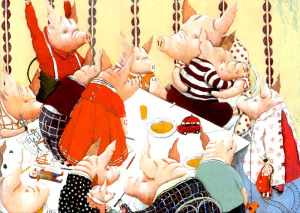 А Алекс со всех ног помчался к своей маме. По дороге он думал, как же оказывается совершенно справедливы все мамы, запрещающие детям есть перед обедом. Дома поросёнок Алекс кинулся в объятия своей мамы, обнял и расцеловал её.
