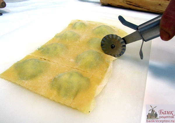Накрываем второй пластинкой теста. Начиная от центра к краям формируем равиоли, постепенно выдавливая лишний воздух. Смазываем белком. Разрезаем ножом для теста с зазубренным дисковым лезвием.